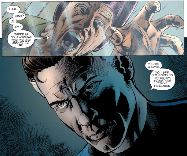 Then we cut to P.A.V.L.O.V., location alone, which is described as a “metahuman psychiatric facility.” Reed is there to check in on the Wizard, who is in a rabid state, ranting about creating clones of himself as a divine calling. Reed gives the Wizard his old helmet back, assuring the doctors that it is now harmless. This makes the Wizard a little more coherent. Reed tells him that the Wizard’s young clone, Bently, has come to live with the FF. Coldy, Reed tells the Wizard that Bently will grow up to become something better than the Wizard.