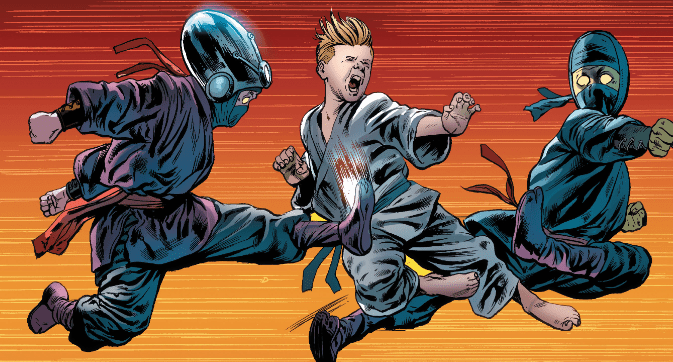 Flame on: While Franklin practices his martial arts, Johnny dresses for it, in a replica of the yellow suit with black stripe, famous for Bruce Lee in Game of Death and/or Uma Thurman in Kill Bill.