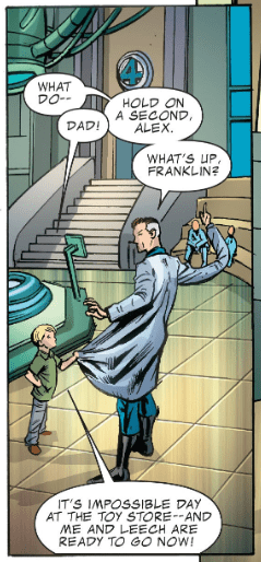 To recap, Reed and the FF have assembled, either by design or by accident, a group of brilliant young people to live at the new Baxter Building. They are now a combined school and think tank (!) called the Future Foundation. As this issue begins, Reed is meeting with some of the kids who have presented their first project as an attempt to solve a scientific conundrum Reed has struggled with for years. Franklin, not technically a member of the Foundation like his sister is, keeps interrupting Reed. The Impossible Man is not only back on Earth, but he’s about to introduce his new toy line (!) at a public event that afternoon. Reed promised Franklin they would go together, but now Reed is too busy with the Foundation.