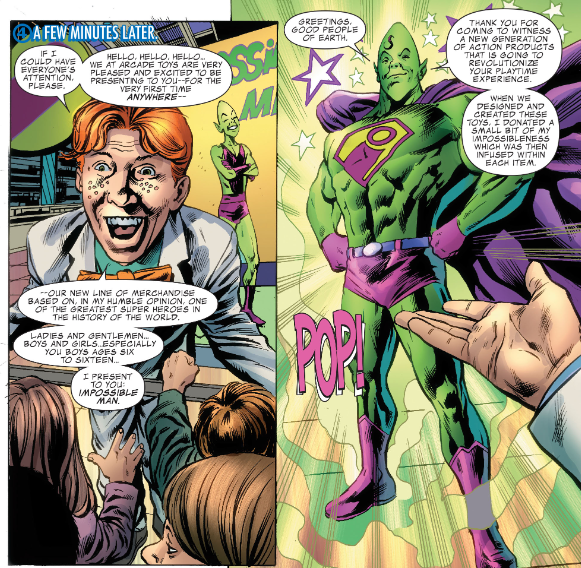 Then there’s a big presentation, where Arcade and Impossible Man introduce the toys, with Impy saying that a little bit of his “impossibleness” is infused in each one. Impossible Man cuts the ribbon, letting a crowd of kids at the toys. Then we see Arcade going back on his promise when he whispered “Okay, maybe a tiny little death trap.” All the toys come to life and attack the kids, punching out Leech. Impossible Man tries to fight back, but he’s overwhelmed by his own toys.