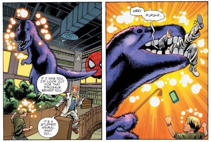 Energy swirls around Franklin’s head, and a dinosaur display then also comes to life, controlled by Franklin. It snatches up Arcade in its teeth, and Franklin tells Johnny to burn all the toys. He does, and then there’s some jokey business about Impossible Man crying that he’s ruined, only for it to be an act. He says he’ll keep an eye on Arcade until the police arrive.