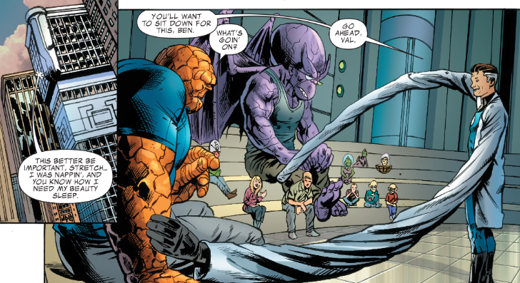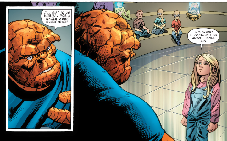 There’s another two pages of revisiting Nu-Earth, where we see what billionaire Ted Castle and the other Nu-Earth characters are doing 500 and then 600 years in the future. Back at the Baxter Building, the Future Foundation kids have invited Ben to join them. Turns out he is the scientific conundrum they’re working on, and they say they can cure him and make him human again. He doesn’t buy it, after all the times Reed has tried and failed, but then Reed admits that the kids have outsmarted him.