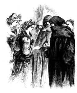 Whoa, drama! But how is this to be staged? Based on my research, this disguise is usually a fake beard and/or a wig. In an epic fantasy retelling, this could be all sorts of magical transformations. Throughout these blogs, I’ve been imagining a wild version where the Sicilians are demonic types and the Bohemians are angelic types. In this version that exists only in my head, here’s where Polixenes could bust out the big angel wings from his back. (I don’t know where I’m going with this.)