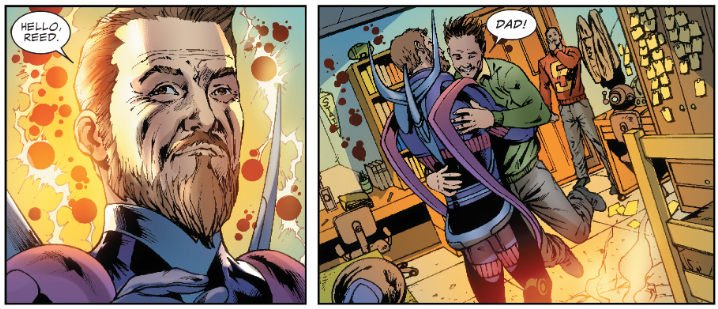 Cut to “years ago,” when Reed is in college, taking an ethics class. He argues that actions in one’s best interest begins with the self, then with family and friends, then the community, and then all mankind. The teacher praises this answer, but young Victor Von Doom stands up and argues that the only right action is one that promotes survival, evolution, and ascendance. Later, Reed commiserates with young Ben about Doom, when the two of them walk into some cosmic energy, right into Nathaniel, just traveled there from the previous scene. Reed hugs him, proclaiming, “Dad!”