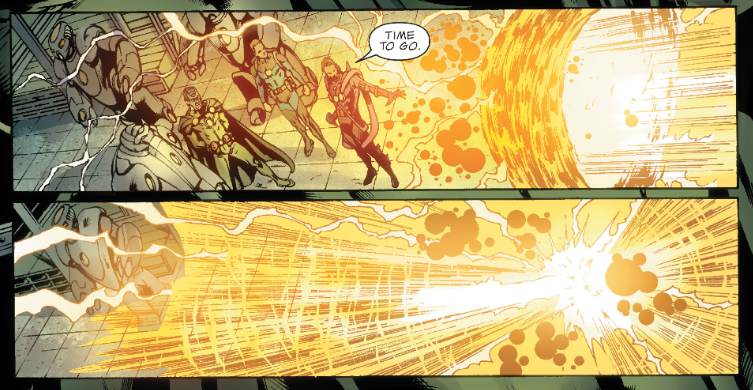 Nathaniel says this visit is his last chance to say goodbye to Reed before the end, but Reed wants to save his father. He then does the unthinkable and goes to Victor for help. Victor has been developing weapons (!) including some big robots. Later, we see Ben outfitted with a high-tech mech suit. It enhances his physical strength, and he says, “I could get used to this.” Not to be outdone, Victor dons a suit of armor of his own, like the classic Dr. Doom armor. Nathaniel opens a portal and says, “Time to go.”
