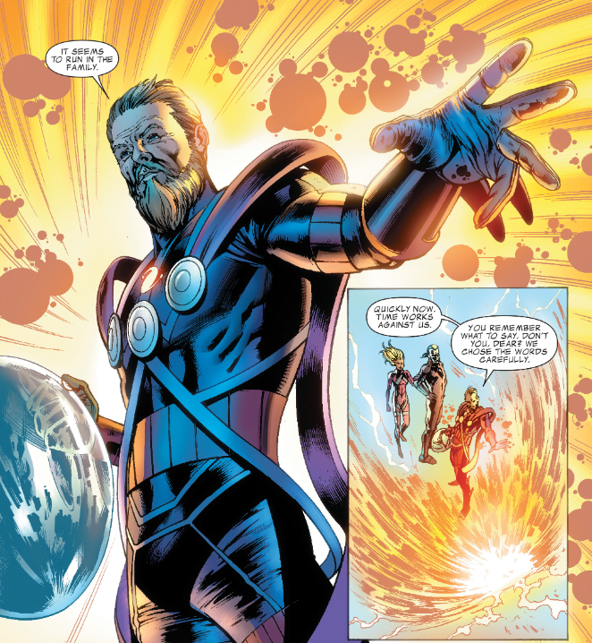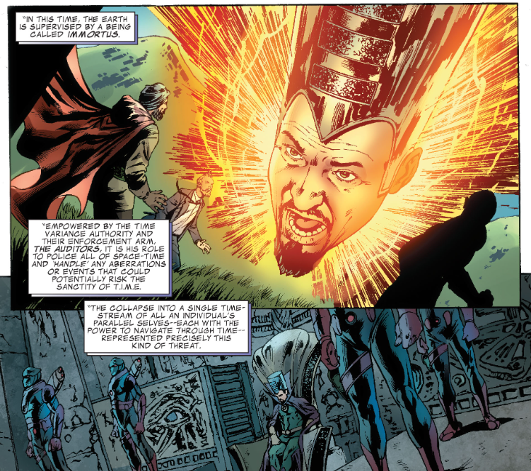 Reed is somehow not full of questions about how and why his father disappeared, and instead it’s all jovial as he introduces Ben to Nathaniel. Nathaniel tells a story about how, in the future, he fought a man with a powerful quantum machine inside him. He failed, and the resulting explosion unstuck Nathaniel through time, and pulled all other Nathaniels from all other alternate realities into one. That man became Immortus, who founded the Auditors, a time police force. A war broke out between all the Nathaniels and all the variants of Immortus. Immortus won, and insisted that all but one Nathaniel had to die in a big Hunger Games/Battle Royale type of death sport. Now there are only two Nathaniels left and they’re hunting each other throughout the timeline/multiverse.