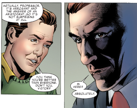 Cut to “years ago,” when Reed is in college, taking an ethics class. He argues that actions in one’s best interest begins with the self, then with family and friends, then the community, and then all mankind. The teacher praises this answer, but young Victor Von Doom stands up and argues that the only right action is one that promotes survival, evolution, and ascendance. Later, Reed commiserates with young Ben about Doom, when the two of them walk into some cosmic energy, right into Nathaniel, just traveled there from the previous scene. Reed hugs him, proclaiming, “Dad!”