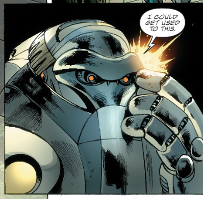 Nathaniel says this visit is his last chance to say goodbye to Reed before the end, but Reed wants to save his father. He then does the unthinkable and goes to Victor for help. Victor has been developing weapons (!) including some big robots. Later, we see Ben outfitted with a high-tech mech suit. It enhances his physical strength, and he says, “I could get used to this.” Not to be outdone, Victor dons a suit of armor of his own, like the classic Dr. Doom armor. Nathaniel opens a portal and says, “Time to go.”