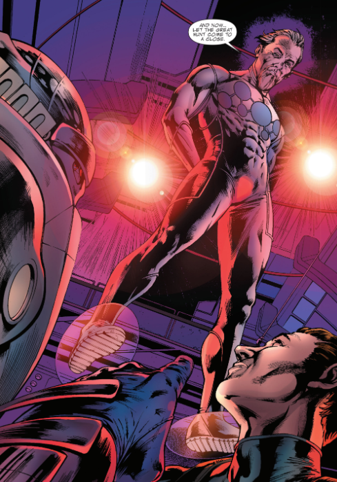 Then we cut to the future, in the ruined city of Chronopolis. Nathaniel leads young Reed, Ben, and Victor through the ruins, with a giant fortress in the distance. They enter the fortress, and Nathaniel and Victor both sense Nathaniel’s enemy nearby. Turn the page to see the alternate Nathaniel floating in air above them, saying, “Let the great hunt come to a close.”