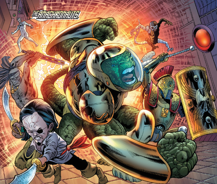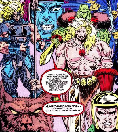 Trivia time: And then there’s the Anachronauts. Originally henchmen of time-travelling villain Kang, the Anachronauts later struck out on their own. The gimmick is that different members of the team are from different time periods. They eventually get tied in with the Black Knight’s complicated continuity and were recurring characters in Force Works, but none of that matters. The Anachronauts seen in this issue are a whole other group of characters from a whole other timeline. This is their only appearance, and their names have never been revealed.