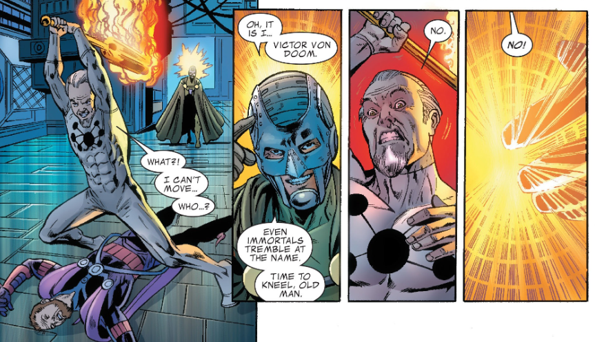 As this issue begins, the time-traveling foursome (heh) explore the ruined city of Chronopolis, where they’re confronted by the enemy Nathaniel, known only as “the Beast.” After a brief fight, the Beast summons his backup team of warriors, the Anachronauts. There’s more fighting, and Nathaniel thinks they should retreat. Reed and Ben fight on, though, turning the tide. Doom finally manages to overpower the beast. Doom tells Nathaniel to deal the killing blow, but Nathaniel refuses. Doom then kills the beast himself. He tells Reed to always remember this day.