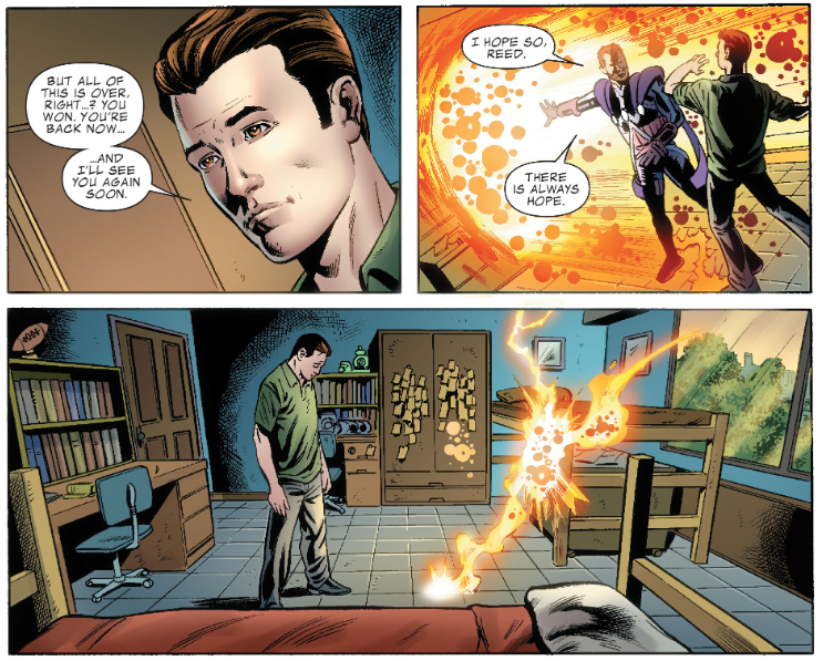 Recap: We’ve learned more about Reed’s time-traveling father Nathaniel Richards, who had been forced into a Hunger Games-style life-or-death competition against all his other selves from other timelines. With only him and one other combatant left, Nathaniel traveled back to Reed’s college years to recruit him, Ben, and young Victor Von Doom to join him in the fight. We’ve also been getting glimpses of Franklin and Valeria in the future, also working with Nathaniel.