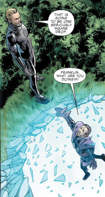 In the present, future Valeria speaks with Sue. She says that Franklin doesn’t like how things turned out, so he’s time-traveling to prepare his younger self for what’s to come. Sue asks Valeria what she wants, and we don’t see the answer. Cut to “Collapsing Space-time,” where Nathaniel reunites with future Franklin. He announces that the mission was a success, and that he’s the only Nathaniel Richards left. Franklin says, “Good,” and threatens to drop Nathaniel into a void. He says, “Something significant was gained today,” and he won’t waste it.