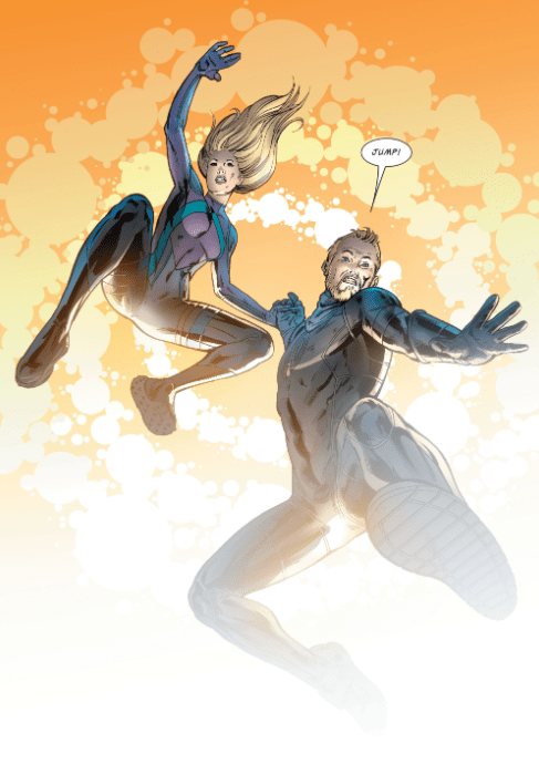 Then things fade away in a two-page spread that’s almost entirely white with only faded imagery in two corners. Turn the page and Valeria returns to Space-time. Franklin’s pocket universe is falling apart, and he says their new future is still 250 yards away. (We’re measuring time travel stuff in yards?) Valeria believes he can create a tunnel for them to go through, but he doesn’t believe they’ll make it. They both agree that they have to try. The last page is the two of them leaping forward, into the unknown.