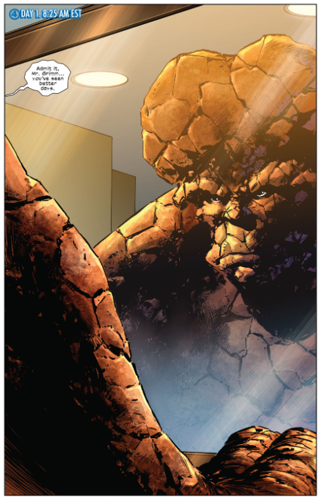 Johnny and Ben spend a day hanging out, going to a ball game, and even enjoying a poker game with other superheroes. On their way back to the car, Johnny and Ben are confronted by the Yancy Street Gang, who are no longer street kids, but full-grown adults in business suits. Ben says they’re all recession-era (era) failed Wall Street guys now. Even in human form, Ben is able to punch them out.