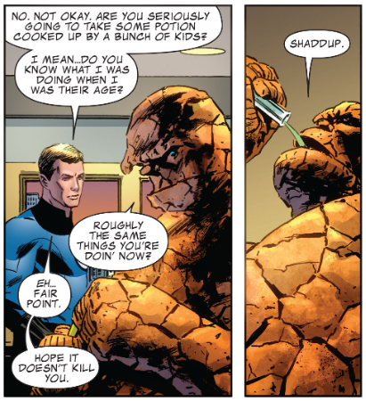 Cut to later, where Ben is considering the potion the Foundation kids made for him, which they say can turn in back into a human for one week per year. With Johnny keeping watch, Ben drinks the formula. It works, and Ben is once again human. Johnny encourages Ben to take advantage of this, and make up for years’ worth of missed opportunities. He promises, “The best day you’ve had in a very long time.”