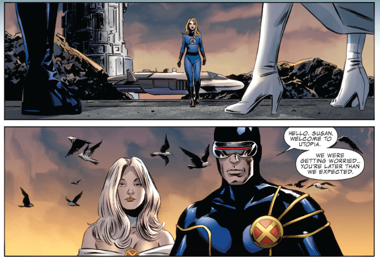Sue arrives not in Old Atlantis, but Utopia Island, home for half of the X-Men. Cyclops’ team live in Utopia, doing the superhero thing, while Wolverine’s team is back at their old school doing the New Mutants thing. She’s greeted by Cyclops and Emma Frost, and then by Namor for the first official negotiation between Old Atlantis and New Atlantis.