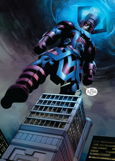 Later that night at the new Baxter Building, Reed is studying a special anomaly far out in space which he nicknames “the Fault.” Then the Silver Surfer flies up and says Reed has more pressing matters, ones involving Galactus. The Surfer says he is angry, and that he found the Galactus corpse hidden deep beneath the Earth. (Remember that the New Defenders used the future Galactus’ body as a power source during their story arc several issues back.) Silver Surfer can tell that the FF had been there, and that the dead Galactus is from the future. Reed promises to explain, but the Surfer says his master is the one who wants explanations. Turn the page, and there’s Galactus himself, looming over the building. “And he would have them now,” the Surfer says.