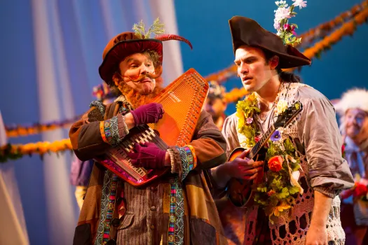 Autolycus removes his fake beard, revealing himself as the man the shepherd’s son met earlier. Despite an aside about how sometimes even he is honest, he puts on a high-minded way of speaking that is so highbrow it comes off like Dr. Suess-style gibberish. And I mean that in a good way, in how that’s the joke – it’s what Shakespeare intended. The “jokes” are about lying versus truth, and sorting out what it means to be a courtier. The real humor of the scene is not so much in what Autolycus is saying, but in the other two guys’ befuddled reactions to him.