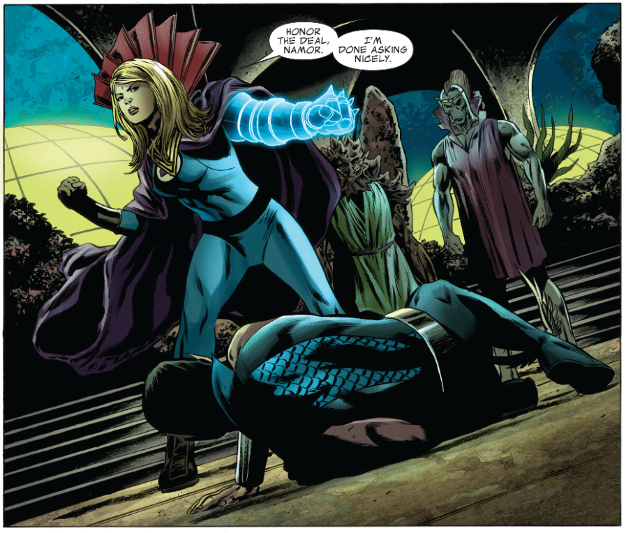 Fade out: Sue punches out Namor by creating invisible force field armor around herself, complete with huge spikes. You have to wonder why she doesn’t do this all the time.