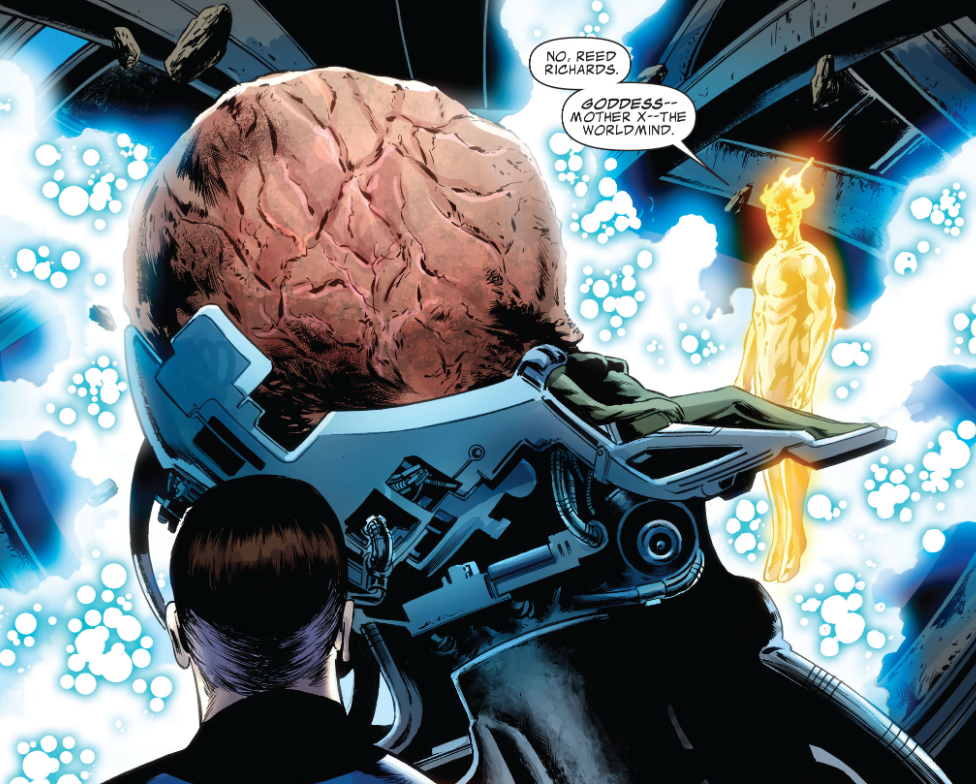 Cut to Thailand, where negotiations between Atlantis and Old Atlantis have broken down following Namor’s murder of the Old Atlantis king. There’s a lot of confusing talk about who is or isn’t a pawn or a sacrifice. The Old Atlanteans say the king’s heirs are too young to take the throne in his place, so rule belongs to the king’s steward – Sue. They all bow before her. Things get even more confusing on Nu-Earth, where Ted says they will not evacuate the planet’s population. The people’s bodies are automatons, and their combined consciousness has been absorbed into the telepath Natalie X, who has evolved into Mother X, a “worldmind” with an impossible huge brain. To evacuate the entire planet, all they have to do is get Natalie off the planet. But then things accelerate, as Galactus isn’t trying to devour the planet like he usually does. In his outrage, Galactus will simply destroy the planet, killing them all so they can’t kill him in the future.