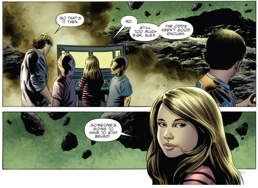 In the Negative Zone, Ben, Johnny, and Franklin fight more insectoids, while the rest of the kids use their genius to figure out how to seal the portal. Reed himself programmed the portal during his pro-reg Civil War days, making it impossible to reprogram. Bently jokes that they should just nuke the portal, but Alex suggests it as a real possibility. The kids set about using tech from the Baxter Building to create a bomb, while Valeria says one of them will have to stay behind to activate it.