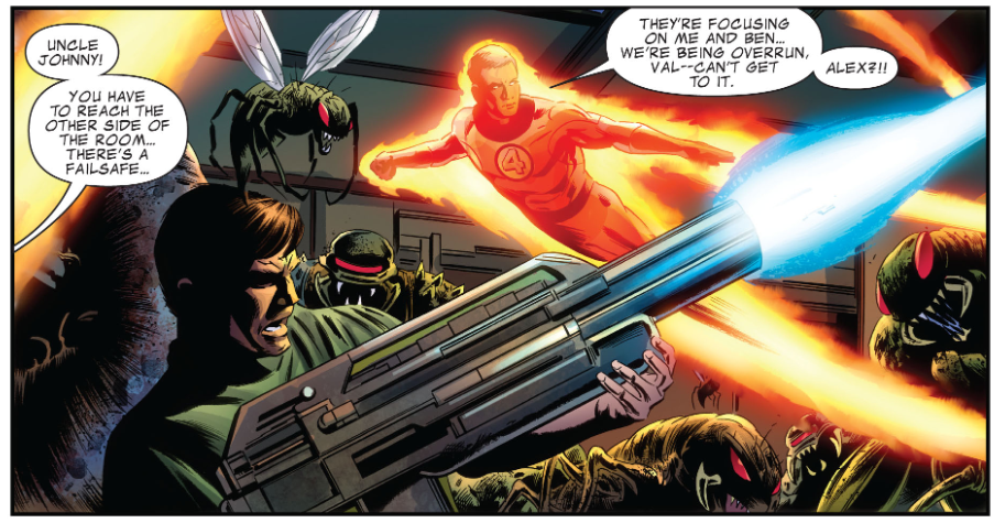 Johnny seals the portal, although everyone on Earth can still see and hear him. He activates the bomb. Ben tries to punch through the portal, transforming back into the Thing as he does so. Johnny asks the others to tell Reed this is where he made his last stand. He says to Ben, “You don’t wish it any more than I do.” He then faces the oncoming army of insectoids. With one last “Flame on!” he goes down fighting as the insectoids overwhelm him. We don’t see this bomb go off. Instead, the portal closes permanently. Ben holds Franklin and Valeria in his arms. The last page of the comic has a number 3 instead of a number 4 logo, with the title, “The Last Stand of Johnny Storm.”