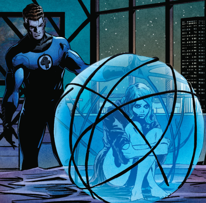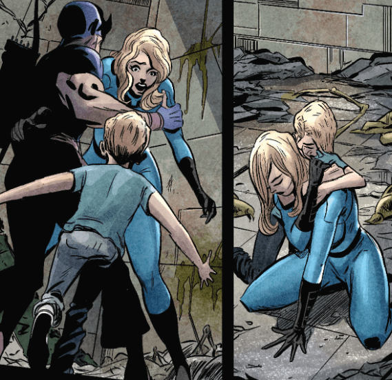 Fade out: Despite sealing herself in a force field at the start of the issue, Sue later holds Reed’s hand at the graveside. I guess that’s her character arc in this one.