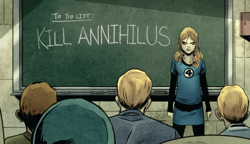 There’s one page of Spider-Man talking with Franklin on a rooftop. Then we see the genius kids of the Future Foundation in their classroom. Valeria makes a to-do list of potential replacements for Johnny. She then erases it and changes to the to-do list to a single item, “Kill Annihilus.”