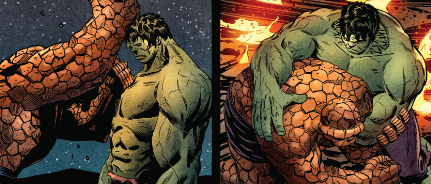 Somewhere out in the desert, Ben talks with two men, who conclude their chat by showing him an image of Johnny’s grave. There’s a flash of lightning, and we see the two men are Donald Blake, now transforming into Thor, and Bruce Banner, now transforming into the Hulk. There’s a brief slugfest, but Hulk refuses to fight back, instead taking Ben’s punches until Ben collapses with grief.