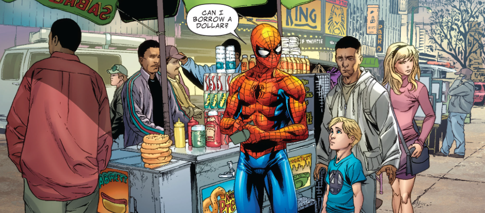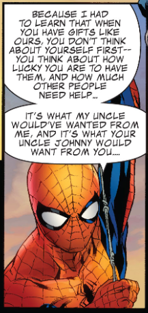 Four and a half: You might recall that Franklin and Spider-Man already had this “Uncle Ben” conversation in Dan Slott’s Spider-Man/Human Torch miniseries. This story, however, takes place after the controversial One More Day event, in which the entire Marvel Universe forgot Spidey’s true identity, so that earlier conversation more or less never happened in continuity.