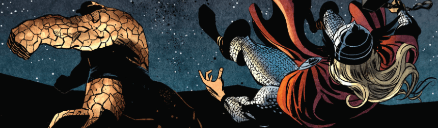 Clobberin’ time: Impressive that Ben can punch Thor so hard that he knocks the thunder god off his feet. Maybe, like the Hulk, Thor is letting himself take the punches.