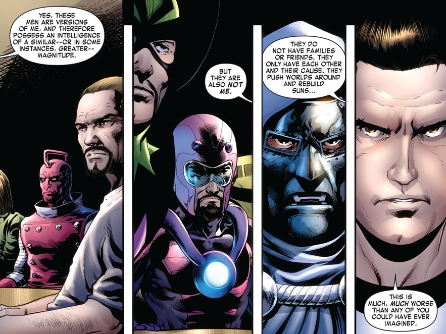 Where were we? The Fantastic Four is now the Future Foundation, with close to twenty members, most of them genius kids in Reed’s makeshift school. Also, Spider-Man has joined the team following Johnny’s death (he’s not really dead). Dr. Doom made a deal with Valeria to join the team in exchange for Reed restoring Doom’s intellect to full strength. Valeria also recently released four members of the Council of Reeds (alternate universe versions of Reed who don’t have Reed’s morals) into Earth. The FF is also still dealing with four lost civilizations they recently discovered, along with a prophecy about a war among those four cities. To deal with the four evil Reeds, the FF have recruited some of their most intelligent enemies to plan a counter-strategy… how to defeat Reed Richards. Got all that?