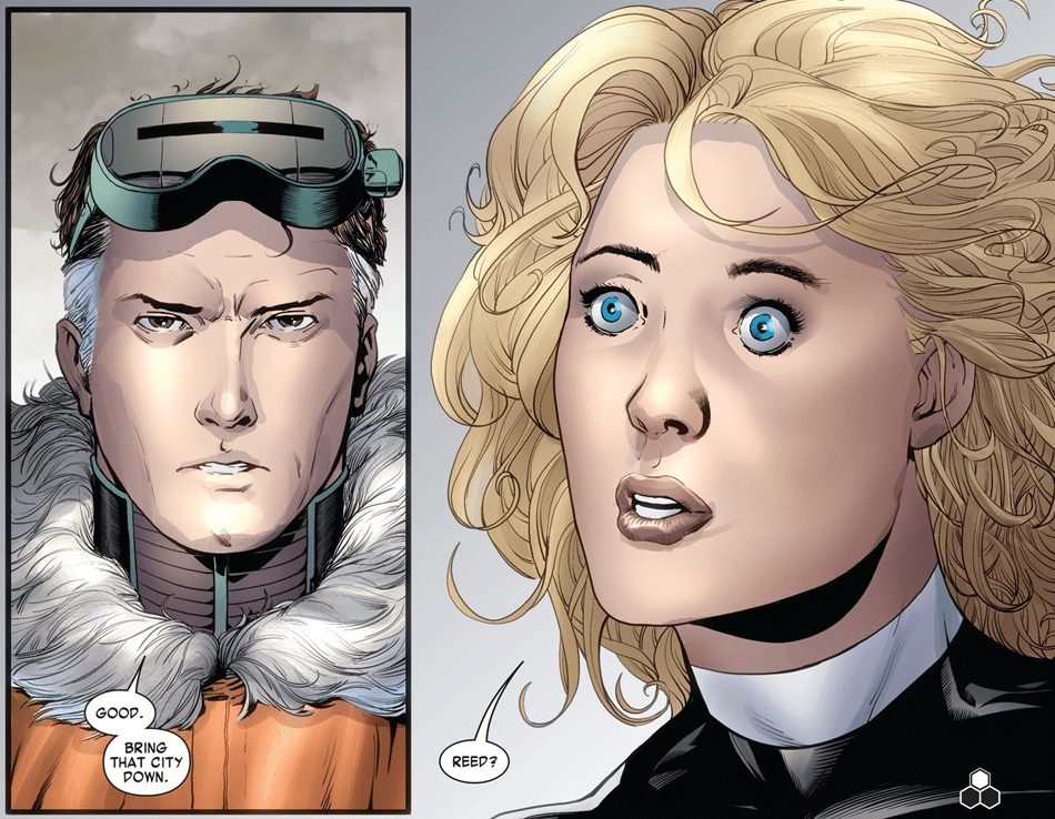 The ground collapses into a huge sinkhole, and the Mole Man emerges. He’s brought his army of Moloids and several of his giant subterranean monsters. There’s also a mysterious hooded man alongside the Mole Man. It’s not a mystery for long, as he pulls the back to hood to reveal he’s one of the alternate Reeds. Sue looks at him with shock, asking “Reed?”