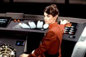 Welcome aboard: All the fan blogs love to point out that new character Lt. Saavik is not just Vulcan, but part Vulcan/part Romulan. The movie doesn’t say this, however. I did a little reading, and allegedly Saavik was created as a new version of Spock for the never-made Star Trek II TV series of the mid-70s. Her Romulan background was written out of Wrath of Khan, apparently because it was an unnecessary detail that didn’t add much to the character. Follow-up novels and comics did more with Saavik, and there’s where her Romulan-ness was made canon.