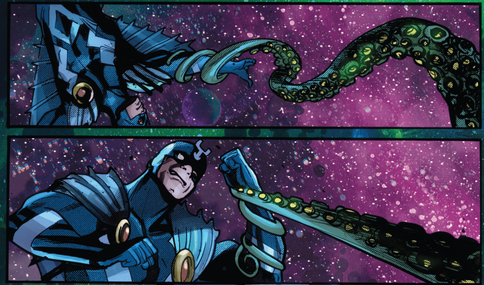 This issue begins still in flashback, located “within the fault,” in deep space, where Black Bolt is under attack by tentacles (wa-hey!). This goes on for a bit until Black Bolt is rescued by the Inhumans’ teleporting dog Lockjaw. On the Kree homeworld of Hala, we’re reminded that the Inhumans recently took that throne, with Medusa ruling in Black Bolt’s place. The Kree all kneel in awe of Black Bolt’s strength and might.