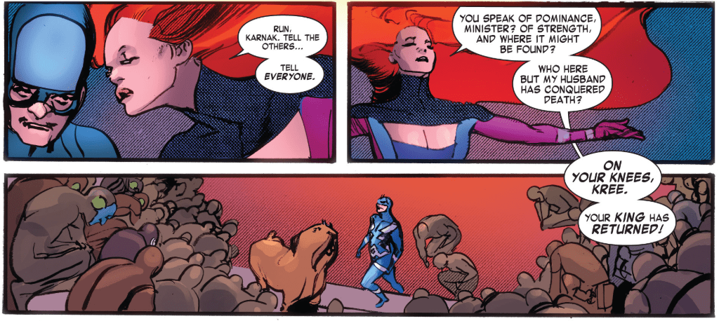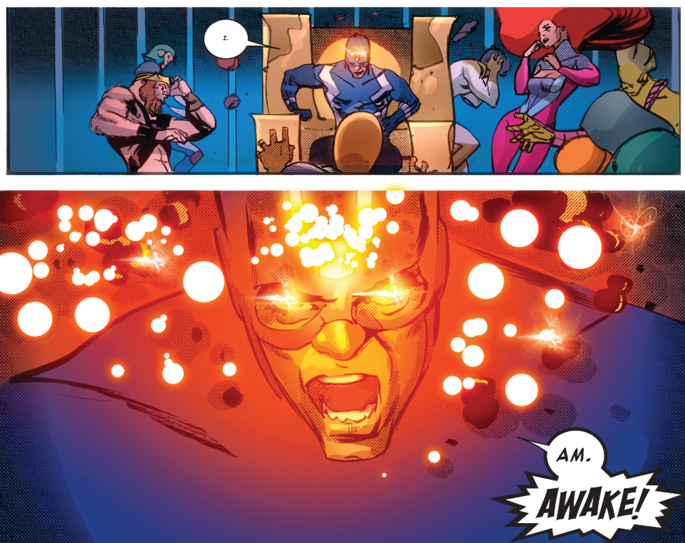 Then there’s some politicking where a Kree regent argues against sending aid from the strong core planets to the weaker and impoverished planets on the fringes of Kree space, saying that this is simply not how the Kree operate. Black Bolt leaves Ronan the Accuser in charge to deal with this matter, as the Inhumans must return to Earth immediately. The Kree all argue against this, saying they gave Black Bolt rulership over the Kree for a reason. The regent asks him what changed and he actually speaks, saying, “I am awake!” His super-powered voice wreaks destruction in the throne room and killing the regent.