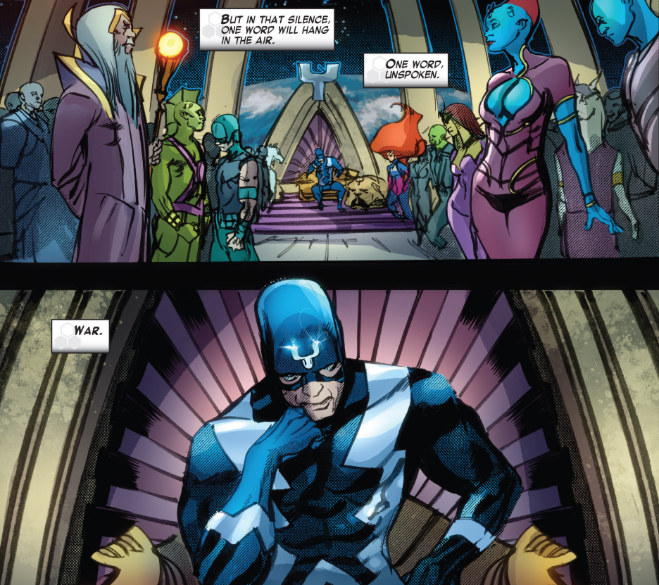 Then we flash forward/flash back to one month earlier, cutting to the moon. Black Bolt and the Inhuman royal family return to Attilan, where they meet the Universal Inhumans, made up of various aliens among these are four queens, from the Badoon, the Centaurians, the Kymellians, and even the Dire Wraiths. These four, along with Medusa, are the five brides mentioned in a prophecy in the previous issue. The captions tell us that the prophecy claims the chosen one has a voice that can shake entire worlds, and will speak one word, “War.”
