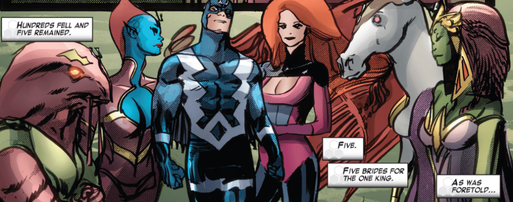 Trivia time: The names of some of Black Bolt’s new brides are familiar, or are they? The Centaurian is Oola Udonta, whom the Marvel Wiki says “may be” related to Yondu Udonta from Guardians of the Galaxy, and the Kymellian is Onomi Whitemane, with no note whatsoever whether she is related to Aelfyre Whitemane from Power Pack.