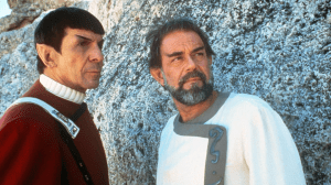 Here’s what happens: Kirk, Spock, and Bones are called in from vacation to the still-being-built Enterprise A following a hostage situation on a hostile desert planet. But the kidnapping is a ruse by Sybok, a Vulcan who’s very in touch with his emotional side. Sybok’s plan is to seize control of the Enterprise and take into the center of the galaxy on a search to find… God. Also, Sybok is Spock’s never-before-mentioned long-lost brother!