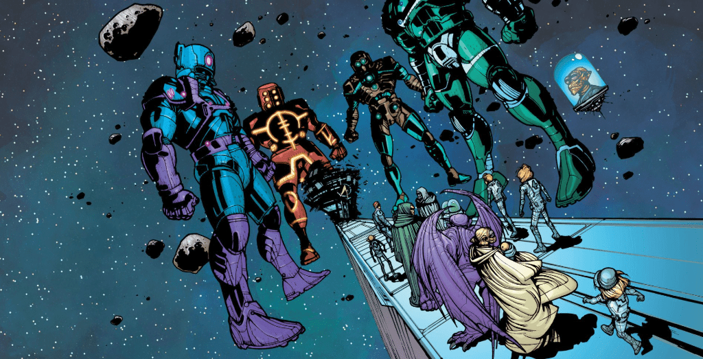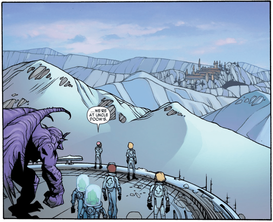 There’s another flashback, this time to the Council of Reeds, where one Reed tells another that the Ultimate Nullifier can be used successfully, but only if the user has enough focus. In the present, the evil Reed falters, pondering how the Council could have changed everything for the better. In his moment of weakness, the Nullifier destroys him. All alone, Dr. Doom stands up to the Celestials, saying he will not be moved. The Celestials blast him, and then they travel through the Bridge to Earth, back atop the mountain in Latveria. It looks as if all is lost, but Valeria says, “We bought enough time.”