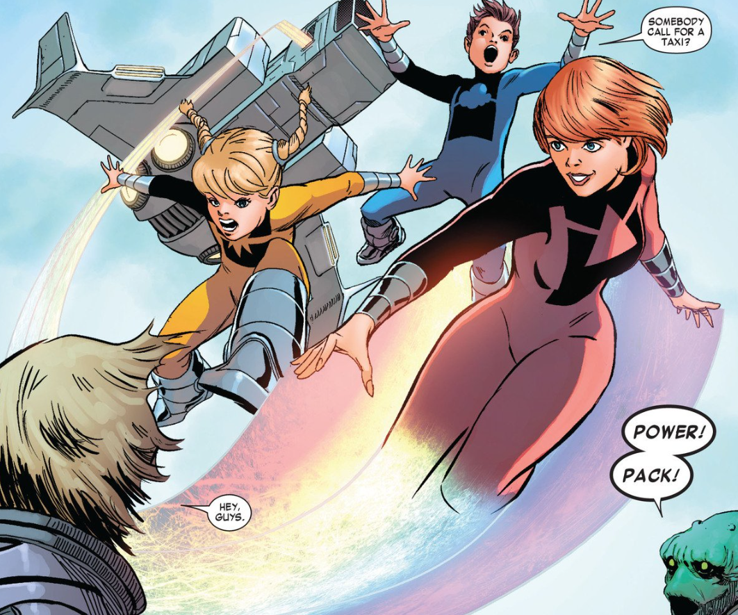 In FF #15, there’s more technobabble as the kids debate what to do about Mad Celestials on Earth. The Bridge is shut down too late, with Dr. Doom on the other side. Kristoff wants to go back for him, but Nathaniel says Latveria needs Kristoff now. Stranded on a mountaintop, Alex Power says help is on the way. It arrives in the form of living spaceship Friday and Alex’s siblings in Power Pack! They’re back in their original outfits, moon boots and all.