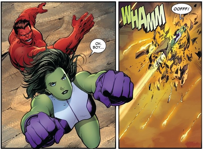 During the fight in New York, She-Hulk and the Red Hulk do their version of Wolverine and Colossus’ famous “fastball special,” where Red Hulk uses his strength to throw She-Hulk at a Kree ship.