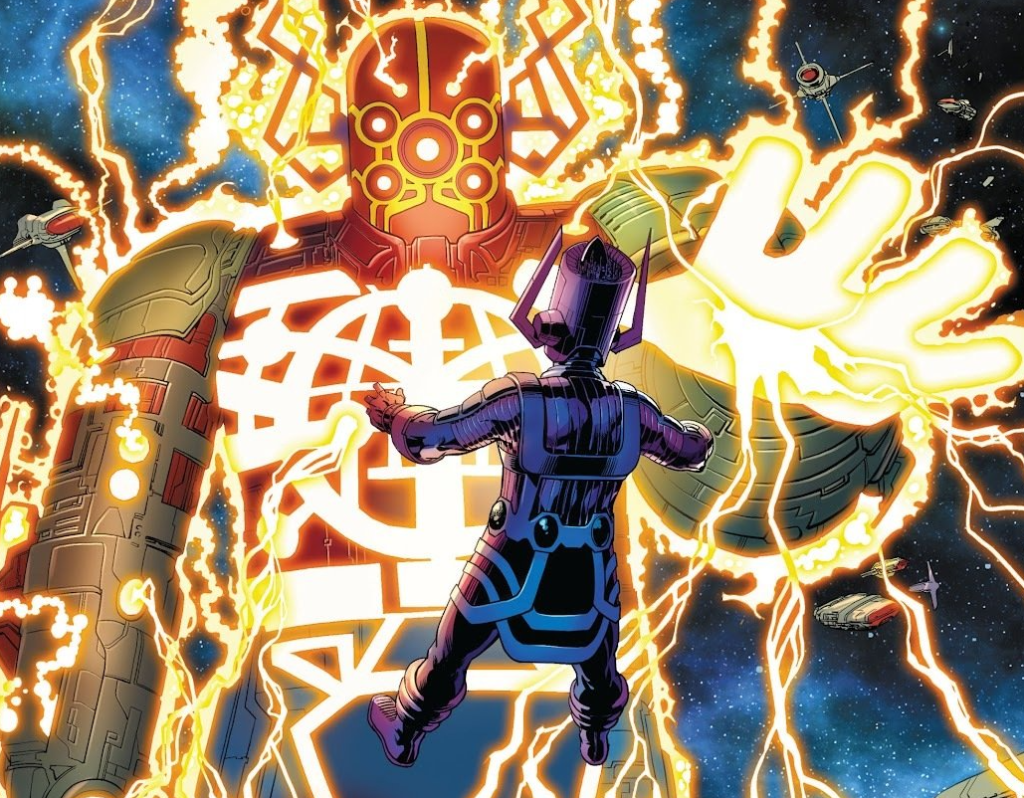 Then it’s a jarring jump back to Fantastic Four #603, where the Mad Celestials are not in Latveria, but confronting Galactus in space. Galactus and the Celestials fight in epic cosmic grandeur, so much so that the Kree and the Inhumans flee Earth for deep space. Galactus kills one of the Celestials, but then the other three form into one bigger Celestial like they’re freakin’ Voltron or something. They blast Galactus back to Earth, seemingly killing him.