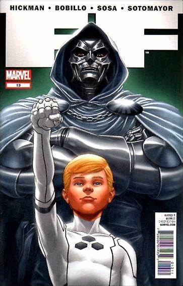 FF #12 follows the kids from the Future Foundation after they teleported several floors of the Baxter Building away from the NYC battle. Unfortunately, they’ve ended up on a mountaintop in Latveria. They’re rounded up by Doombots and taken to the castle. There, Nathaniel Richards and an evil Reed have subdued Dr. Doom before Kristoff, who is currently ruling the country. Valeria and Nathaniel have a conversation about time travel, and he says he’s the one who sent Franklin from the future to give her message that “all hopes lie in Doom.”
