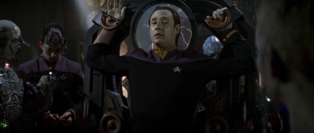 Welcome aboard: The Borg’s collective consciousness makes them scary and intimidating, but it also means they can’t have character development. Enter the Borg Queen to speak on their behalf. She says the Borg are all about seeking perfection, while Data answers, “I question your motives.” Borg continuity is all over the place throughout Trek history. I say this is because they are always evolving with every new person and/or tech they assimilate.