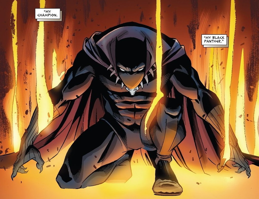 In Fantastic Four #608, Reed and Black Panther open a door in the underground chamber, which Panther says is “forbidden to the living” and “This is where Black Panthers are laid to rest.” They arrive at the city of the dead, and they enter a temple where Bast is waiting for them. Bast says the two of them will be judged, and that this will create an inseparable bond between Reed and T’Challa. T’Challa starts to ask Bast how to defeat Anubis, but Anubis goads him into admitting what he really wants – to be king again. Bast says a great catastrophe is coming for Wakanda, and that T’Challa could be its salvation. He agrees to let Shuri remain on the throne so he can complete this greater work. He will be king of the Necropolis, with all the powers of past Black Panthers running through him.