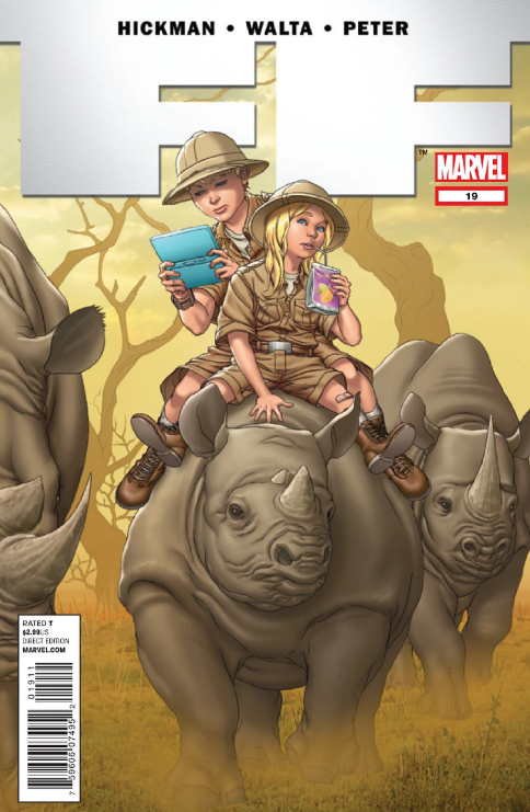 Four and a half: Once again, we raise the question of whether Franklin is considered a member of the Future Foundation. He has the uniform, but in this issue he refers to it as “their” school, and says his homework is different from theirs.