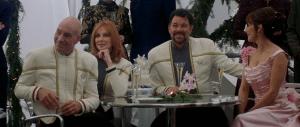 Continuity café dessert: And just because I know everyone’s going to ask, my antiquated two-disc DVD set has the Wil Wheaton deleted scene where we catch up with Wesley Crusher. There’s no mention of him running off with that Traveler guy, but we learn he’s back in Starfleet and that he’s joining the crew of Riker’s new ship the Titan. (Talk of the Titan in this movie sets up a long-running series of novels, but that’s a whole other thing.)