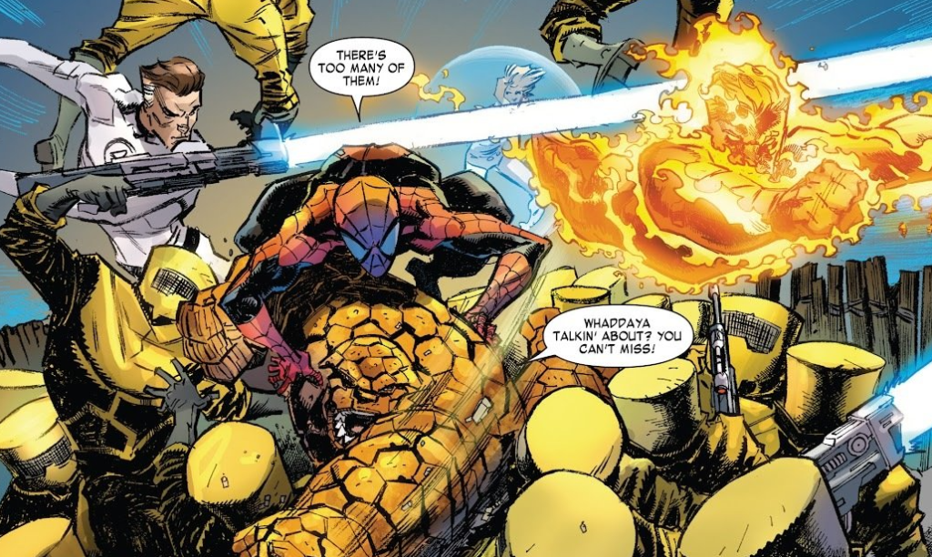 Fantastic fifth wheel: Spider-Man is still acting as a full-on member of the Fantastic Four throughout these issues, but he’s back in his classic red and blue uniform by now. In Attilan, a Light Brigade alien mistakes him for a human man she once romanced, for some comedy.